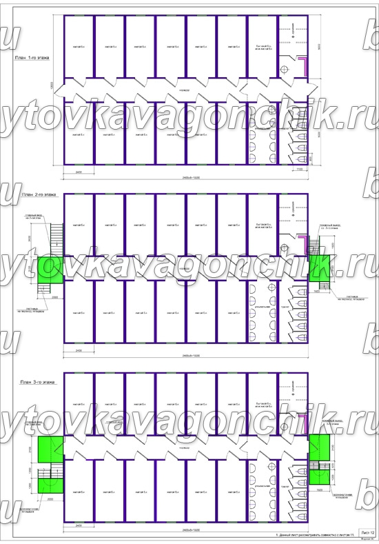 Планы трехэтажного общежития на 150 человек из 48 шт БК
